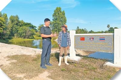 泰国孔敬府班克镇镇长甲卡蓬(左)与当地村民在中国援建的水堰旁交流。